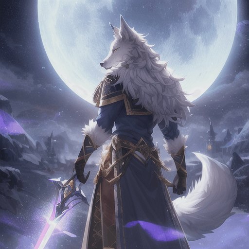 + Furry, portrait of a male anthro wolf fursona,fantsy, wearing fantasy costume,background, beautiful composition, lightingextremely, ray tracing, Fur Affinity,holding a sword in hand, moon,4k,dutch angle shot,looking back,illusion effect,magic effect